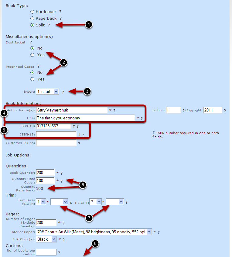 6)These fields will only appear if you chose "SPLIT" on the BOOK TYPE section at the top of this screen. The "Quantity Paperback" field will auto-calculate based on the two fields above it.